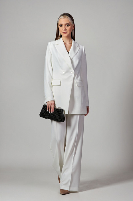 Брючный комплект из костюмной ткани на подкладке. Двубортный жакет полуприталенного силуэта с отрезными бочками и вытачками по переду и спинке. Воротник-с отложными лацканами пиджачного типа. По переду - прорезные карманы с клапанами. Рукава длинные, двухшовные. Жакет застегивается на две пуговицы. Брюки прямые со складкой, широким поясом-обтачкой, наклонными карманами. Застегиваются на молнию по переду и пуговицу.