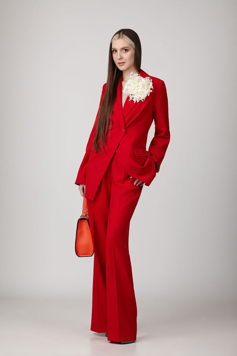 Брючный комплект из костюмной ткани на подкладке. Двубортный жакет полуприталенного силуэта с отрезными бочками и вытачками по переду и спинке. Воротник-с отложными лацканами пиджачного типа. По переду - прорезные карманы с клапанами. Рукава длинные, двухшовные. Жакет застегивается на две пуговицы. Жакет декорирован цветами-брошами ручной работы. Брюки прямые со складкой, широким поясом-обтачкой, наклонными карманами. Застегиваются на молнию по переду и пуговицу.