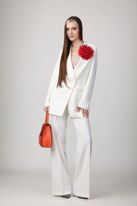 Брючный комплект из костюмной ткани на подкладке. Двубортный жакет полуприталенного силуэта с отрезными бочками и вытачками по переду и спинке. Воротник-с отложными лацканами пиджачного типа. По переду - прорезные  карманы  с клапанами. Рукава длинные, двухшовные. Жакет застегивается на две пуговицы. Жакет декорирован цветами-брошами ручной работы. Брюки прямые со складкой, широким поясом-обтачкой, наклонными карманами. Застегиваются на молнию по переду  и пуговицу.