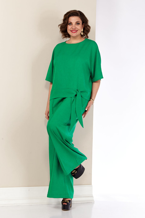 Стильный летний комплект двойка, состоящий из блузы и брюк. Блуза свободного силуэта, с притачным широким поясом на завязку. Вырез горловины округлой формы. Рукав цельнокроеный. Спинка с центральным швом.
