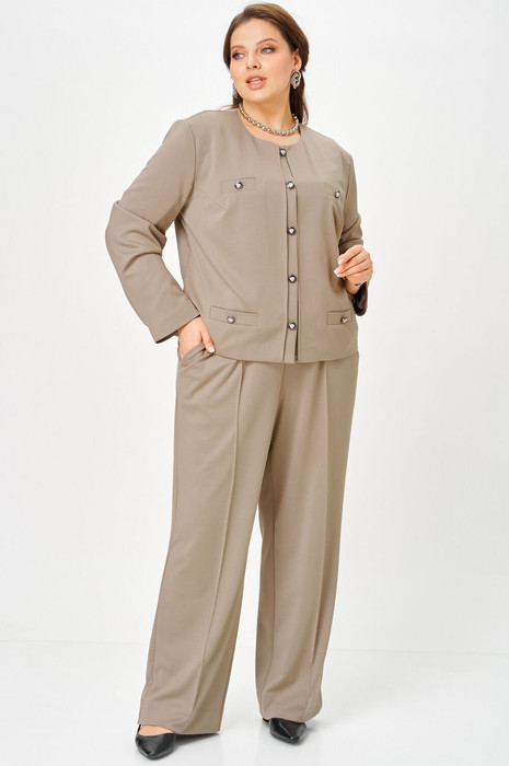 Прямые брюки с отстроченными стрелками визуально вытягивают силуэт, создавая   вертикаль. Посадка высокая комфортная, линии — чистые и вытянутые, поэтому костюм одинаково хорошо смотрится на девушках, женщинах высокого, среднего и невысокого роста. Пропорции продуманы таким образом, чтобы модель уверенно садилась на любой тип фигуры.