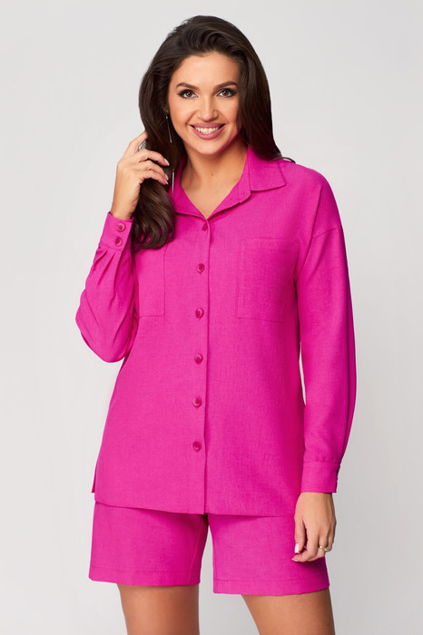 Рубашка свободного прямого кроя с втачным спущенным рукавом. По переду в верхней части накладные карманы. Застежка центральная на 8 петель и пуговиц. Воротник отложной на стойке. В боковых швах обработаны разрезы. Рукав длинный, по низу притачная манжета с застежкой на 2 петли и пуговицы.