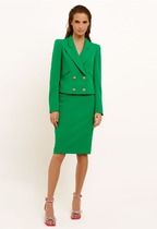 Жакет прямого силуэта с цельнокроенным рукавом летучая мышь, без застежки. По горловине отложной воротник на стойке. Спинка со сборкой из-под кокетки. В боковых швах обработаны разрезы. По низу рукава отложная манжета.