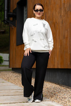 Комплект женский, 2х предметный, состоящий из джемпера и брюк. Комплект выполнен из двух видов трикотажного полотна и отделойной текстильной ткани. Джемпер прямого силуэта с длинным рукавом. Рукав со спущенной линией плеча, снизу на манжете. По переду и спинке горизонтальный подрез, со сменой ткани и отделочной нашивкой спереди. По рукаву вставка треугольной формы из отделочной ткани. Горловина круглой формы с подрезной бейкой. Низ присобран на регулируемую кулису. Брюки прямые, свободные, по низу на манжете, частично с резинкой. По бокам вставки треугольной формы из отделочной ткани. Спереди функциональные карманы. Пояс притачной, с резинкой сзади и частично по переду.