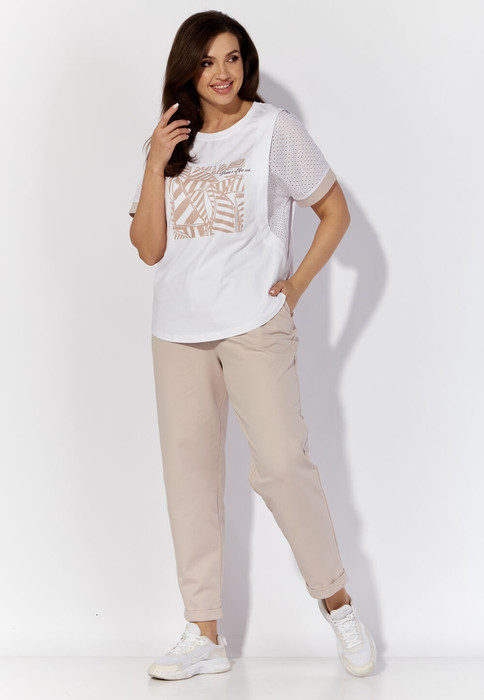 Блузка прямого силуэта, выполнена в сочетании вискозного трикотажного полотна и шитья. Рукав короткий, цельнокроеный с манжетой. По переду и спинке фигурные рельефы с отлетными планками. Горловина круглой формы с подрезной бейкой. Центр переда задекорирован принтом. На спинке кокетка и отделочная нашивка. Низ фигурной формы.