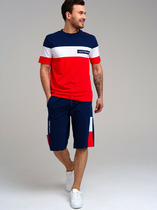 Костюм мужской из кулирки майка + шорты. Майка с принтом в виде надписи, цветные вставки, окантовка. Шорты аналогичного дизайна, цветные вставки, по бокам карманы, длина чуть ниже коленей. Две расцветки — красная и синяя. Размеры от 44 до 58. Возможен заказ в розницу.