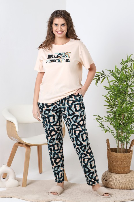 Костюм женский из трикотажного полотна «кулирка» в комбинации двух видов: гладкокрашеного и с набивным рисунком в единой цветовой гамме, состоящий из футболки и брюк. Футболка – из гладкокрашеного полотна, с короткими втачными рукавами, горловиной овальной формы, обработанной притачной бейкой из основного материала и принтом на полочке, выполненным методом «шелкографии».Брюки – из полотна с набивным рисунком, длинные, на притачном поясе с эластичной тесьмой внутри и карманами в боковых швах.