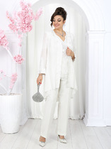 Костюм женский из гладкокрашеного трикотажного полотна футер-двунитка, состоящий из футболки и брюк. Футболка – классического покроя, с короткими втачными рукавами и горловиной овальной формы, обработанной втачной планкой. В нижней части полочки слева настрочен декоративный элемент прямоугольной формы.Брюки – длиной 7/8, слегка зауженные книзу, на притачном поясе с эластичной тесьмой внутри и карманами в боковых швах. Передние половины брюк застрочены по линиям центра вдоль на 0,3 см.