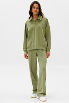 Костюм женский из гладкокрашеного трикотажного полотна футер-двунитка, состоящий из футболки и брюк. Футболка – классического покроя, с короткими втачными рукавами и горловиной овальной формы, обработанной втачной планкой. В нижней части полочки слева настрочен декоративный элемент прямоугольной формы.Брюки – длиной 7/8, слегка зауженные книзу, на притачном поясе с эластичной тесьмой внутри и карманами в боковых швах. Передние половины брюк застрочены по линиям центра вдоль на 0,3 см.