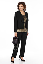 Костюм состоит из жакета и брюк. Жакет без подкладки прямого силуэта, с двубортной застежкой на петли-пуговицы, длиной до середины бедра. Перед жакета с нагрудными вытачками, в области груди расположена декоративная листочка и нашивка. Спинка с двойной кокеткой, в шве притачивания которой обработана встречная складка. Низ жакета фигурный, с закруглениями по боковым швам. Рукава двушовные, длиной  3/4, по низу с манжетой, застегивающейся на петлю и пуговицу. Горловина оформлена воротником пиджачного типа.  Брюки классической формы, прямые от линии бедер, со стрелками по передним и задним половинкам. Верхний срез обработан поясом, в который от бокового шва вставлена резинка по задним половинкам. В боковых швах обработаны наклонные карманы. На задних половинках расположены талиевые вытачки. В комплект входит пояс из основной ткани с декоративной пряжкой.