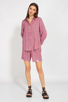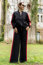 Жакет женский укороченный, без застежки с шестью декоративными пуговицами, расположенными параллельно борту и погонами по плечевым швам. Погоны закреплены пуговицей и имеют прямые углы. Перед с нагрудной вытачкой, выходящей из бокового шва. Спинка с рельефными швами, выходящими из проймы до низа и средним швом. Рукава втачные двухшовные, длинные. Горловина круглой формы, обработана воротником-стойкой.