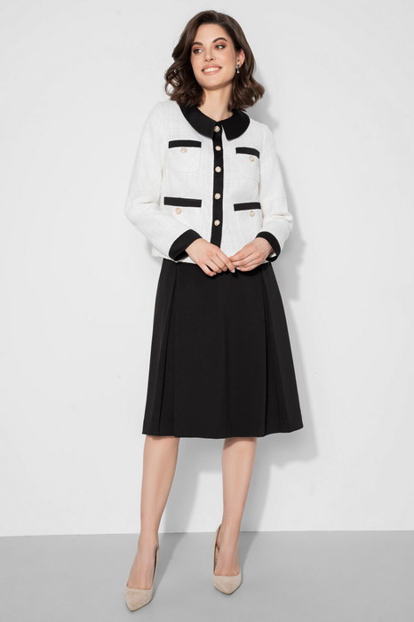 Этот стильный женский костюм с юбкой — идеальное сочетание элегантности и комфорта. Жакет из белого твида с контрастной отделкой придаёт образу изысканность, а чёрная юбка добавляет строгости и шарма. Костюм идеально подойдёт для деловых встреч, офисных будней и формальных мероприятий.