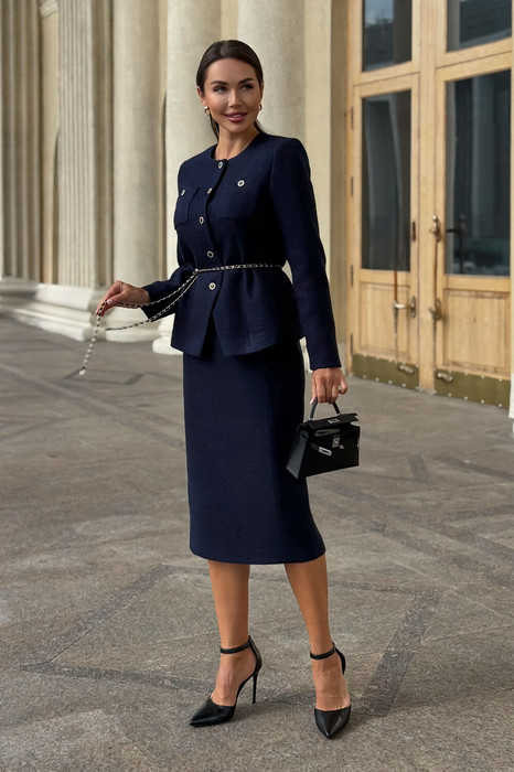 Элегантный синий твидовый костюм женский с юбкой от бренда URS создан для тех, кто ценит безупречный стиль, утонченную классику и современный деловой образ. Эта модель воплощает лучшие традиции женской одежды из твида, сохраняя узнаваемую эстетику твидовых костюмов, вдохновленных стилем Chanel, и при этом полностью соответствует требованиям современной моды, дресс-кода и офисного этикета. Костюм женский 2-х предметный, состоящий из жакета и юбки, из костюмной ткани рогожка. Костюм может быть как нарядный, так и для повседневной носки.