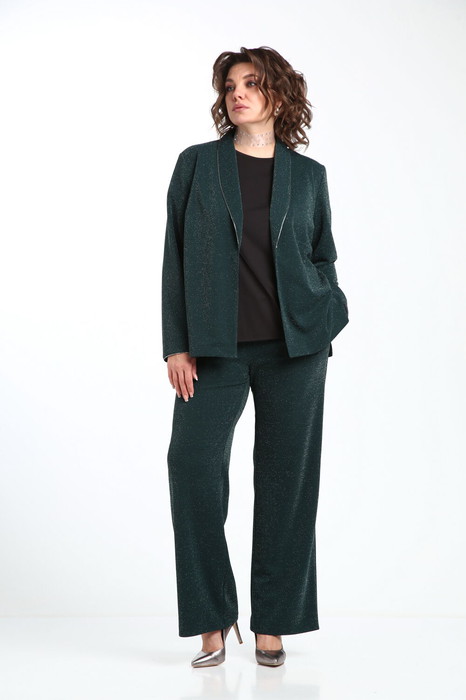 Брюки прямые от бедра и до низа с притачным поясом на резинке и боковыми карманами. Длина жакета по спинке - 65 см. Длина рукава жакета - 61 см. Длина брюк по центру передней половинки - 104 см.