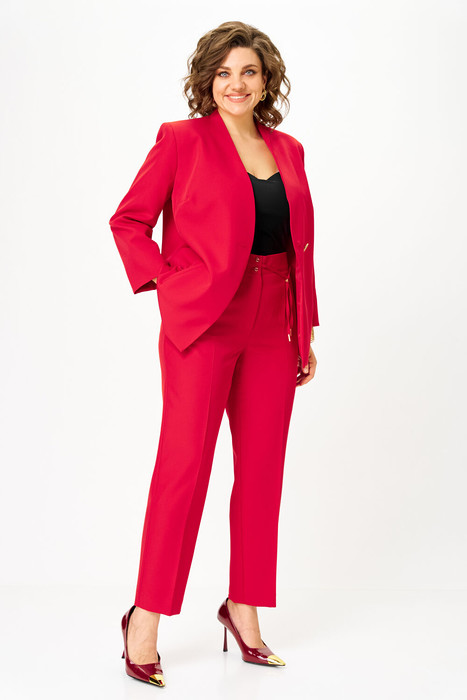Костюм женский двухпредметный, состоящий из жакета и брюк. Жакет полуприлегающего силуэта со спущенной застежкой на одну декоративную петлю-пуговицу и одну потайную. Перед с отрезным бочком, в котором обработана вытачка, и с карманами с листочкой. Спинка со средним швом. Борт имеет фигурную форму. Горловина - по переду цельнокроенная стойка, а по спинке - отрезная со средним швом. Рукава втачные длинные двухшовные. Брюки классического кроя, зауженные к низу, с притачным поясом, от входа в карман вкруговую с широкой резинкой. Застежка на тесьму-молнию в средних срезах передних половинок и на 2 петли-пуговицы по поясу. Также по поясу вставлен шнурок с фиксатором и наконечниками. Карманы наклонные к боковому шву. На брюках заутюжены канты.