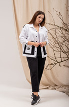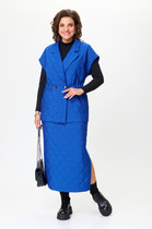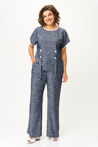 Костюм женский двухпредметный, состоящий из жакета и брюк. Жакет полуприлегающего силуэта, удлиненный, с центральной бортовой застежкой на 2 петли-пуговицы до линии перегиба лацкана. Перед с нагрудными вытачками, выходящими из горловины. Боковые швы с разрезами, между которыми по спинке вставлен пояс фигурной формы с декоратичной нашивкой. Спинка со средним швом. Воротник пиджачного типа. Рукава втачные двухшовные длиной 3/4. Брюки палаццо с притачным широким поясом на резинке от заутюженных стрелок по передней половинке вкруговую. Застежка на тесьму-молнию в средних срезах передних половинок брюк и 2 петли-пуговицы по поясу.