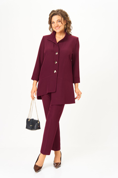 Комплект женский, состоящий из туники и брюк. Туника А-образного силуэта с центральной застежкой на планку до подреза на 3 декоративные петли-пуговицы. Перед с нагрудной вытачкой и фигурными подрезами. Спинка с горизонтальной кокеткой и двумя складками. В боковых швах обработаны разрезы. Низ переда ассиметричен и слегка разведен. Рукава втачные одношовные длиной 3/4 с защипом, имитирующим манжет. Воротник-стойка. Брюки классического кроя, зауженные к низу с притачным поясом сзади на резинке. Застежка на тесьму-молнию в среднем шве передних половинок и 1 петлю-пуговицу по поясу. На брюках заутюжены канты.