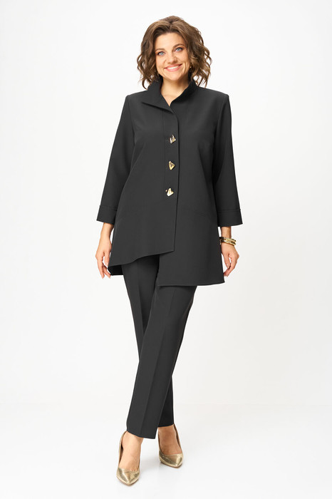 Комплект женский, состоящий из туники и брюк. Туника А-образного силуэта с центральной застежкой на планку до подреза на 3 декоративные петли-пуговицы. Перед с нагрудной вытачкой и фигурными подрезами. Спинка с горизонтальной кокеткой и двумя складками. В боковых швах обработаны разрезы. Низ переда ассиметричен и слегка разведен. Рукава втачные одношовные длиной 3/4 с защипом, имитирующим манжет. Воротник-стойка. Брюки классического кроя, зауженные к низу с притачным поясом сзади на резинке. Застежка на тесьму-молнию в среднем шве передних половинок и 1 петлю-пуговицу по поясу. На брюках заутюжены канты.