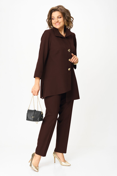 Комплект женский, состоящий из туники и брюк. Туника А-образного силуэта с центральной застежкой на планку до подреза на 3 декоративные петли-пуговицы. Перед с нагрудной вытачкой и фигурными подрезами. Спинка с горизонтальной кокеткой и двумя складками. В боковых швах обработаны разрезы. Низ переда ассиметричен и слегка разведен. Рукава втачные одношовные длиной 3/4 с защипом, имитирующим манжет. Воротник-стойка. Брюки классического кроя, зауженные к низу с притачным поясом сзади на резинке. Застежка на тесьму-молнию в среднем шве передних половинок и 1 петлю-пуговицу по поясу. На брюках заутюжены канты.