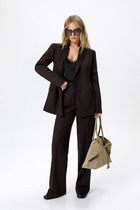 Брюки прямого силуэта с центральной застёжкой на молнию и петлю-пуговицу.