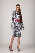 Жакет полуприлегающего силуэта с естественной линией плеча. Перед с центральной бортовой застежкой на петли-пуговицы. По переду и спинке для придания прилегания застрочены складки. Воротник - цельнокроеная стойка. Рукав втачной длинный. В локтевом шве рукава обработана отлетная шлица с отделочной пуговицей.