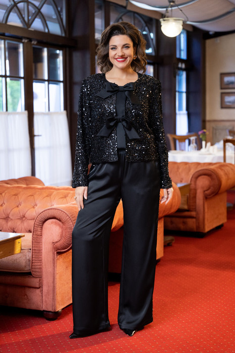 Брюки свободные расширенного силуэта. По бокам выполнены лампасы из полотна с пайетками. Пояс притачной на резинке. В боковых швах карманы.