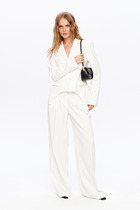 Брюки свободные расширенного силуэта. По бокам выполнены лампасы из полотна с пайетками. Пояс притачной на резинке. В боковых швах карманы.