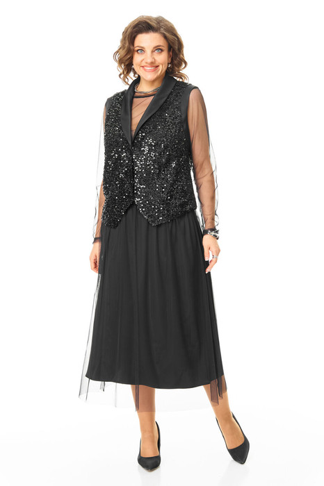 Жилет полуприлегающего покроя на подкладке из шелковой атласной ткани. Пред и спинка выполнены из полотна с пайетками. По проймам выполнены бейки из атласной ткани. Низ жилета фигурной формы. Застёжка однобортная на потайные кнопки. Воротник отложной типа "шаль" из атласной ткани.