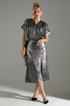 Юбка прямого силуэта, длины «миди» со средним швом по переде  переходящим в разрез. По заднему полотнищу юбки талиевые вытачки. Пояс притачной с эластичной тесьмой-резинкой, которая обеспечивает максимально удобную посадку на любой тип фигуры. Юбка на подкладке.