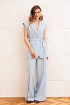 Комплект женский, состоящий из блузы и юбки. Блуза  свободного силуэта, почти бесформенная, легко ниспадает, подчёркивая лёгкость и непринуждённость. Фактурный трикотаж, имеет небольшую прозрачность. Блуза укороченная, с округлой формой горловины. Рукав по форме летучая-мышь. Спинка без особенностей. Юбка  трапециевидного силуэта с притачной кокеткой по верху юбки. Застёжка на декоративную тесьму молнию в среднем шве спинки юбки. Главной особенностью юбки является конструктивные подрезы выполненные горизонтально и вертикально с отстрочкой контрастного цвета. Длина блузы по спинке 66 см (р 50-54), 67 см (р 56-60). Длина юбки 82 см.