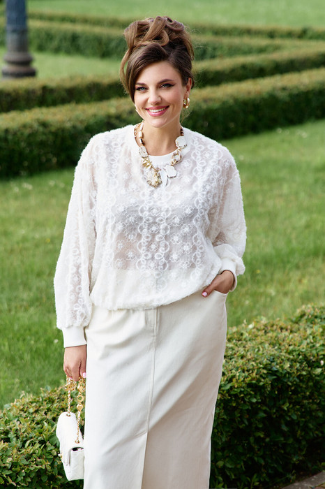 Женский комплект, состоящий из блузона из полупрозрачной ткани в изысканную пушистую вышивку и юбки длины «миди» из плотного джинса. Блузон выполнен из тонкой прозрачной с вышивкой ткани, которая актуальна в этом сезоне. Верх свободного силуэта, со спущенной линией плеча, низ присобран на тесьму-резинку. Горловина без воротника округлой формы обработана трикотажной эластичной планкой.  Рукав втачной, одношовный, из основной ткани со сборкой по низу и притачной манжетой из эластичного трикотажа. Юбка из джинсовой ткани без подкладки, прямого силуэта, длины «миди». По переду юбки средний шов со шлицей и застежкой - молния вверху на петлю и пуговицу. Джинсовые карманы и боковые рельефы с двойной отстрочкой. Задняя часть также со средним швом и шлицей внизу. Пояс в юбке притачной на эластичной тесьме-резинке. Длина блузы по спинке 66 см (р 52-56), 67 см (р 58-62), длина рукава 56 см. Длина юбки 82,5 см.