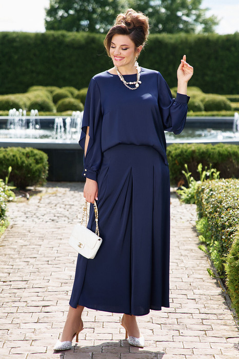 Данный костюм отлично подходит для торжественных мероприятий, свиданий, работы в офисе если дополнить его соответствующими аксессуарами и обувью Блузка свободного силуэта, с фигурной линией горловины по форме «лодочка»; по переду блузки нагрудные вытачки. По спинке блузки вырез капелька с застёжкой на пуговицу. Рукав втачной, длинный с фигурным вырезом, по низу рукава манжета с застёжкой на петли пуговицы. Брюки-кюлоты свободного силуэта, длиной 7/8 расширяются к низу. Пояс притачной со вставкой эластичной тесьмы-резинки, которая обеспечивает максимально удобную посадку на любой тип фигуры. По переду брюк от верха застрачиваются складки. В задней части брюк застёжка на тесьму-молнию в шве и пуговицу в поясе. В боковых швах брюк - карманы. Длина блузки от высшей точки плечевого шва до низа 60 см (р 50-54), 61 см (р 56-60).  Длина рукава 61 см (р 50-54), 62 см (р 56-60). Длина брюк по боковому шву от шва притачивания пояса 93 см (р 50-54), 94 см (р 56-60).