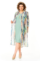 Комплект женский, состоящий из блузки и брюк. Блуза (состав: 61%район, 39%вискоза) выполнена из ткани с тонким шёлковым блеском - мерцает при движении. Блуза свободного силуэта с вырезом горловины в виде «лодочки». Спинка без особенностей. Низ ассиметричный с разрезами в боковых швах от низа. Рукав в блузе втачной на подкладке, в виде буфа, с залаженными декоративными складками по окату и низу. В комплекте идёт пояс из основной ткани. Брюки (состав: 60% полиэстер, 40% полиуретан) прямого силуэта из кожи с рельефами и отстрочкой по переду. По переду застежка на тесьму молнию в гульфике и пуговицу в поясе. По переду брюк наклонные карманы. Пояс притачной со вставкой эластичной тесьмы резинки в «бочках», что обеспечивает комфортную посадку на фигуру. Длина блузы 76,5 см (р 50-54), 77 см (р 56-60), длина рукава 37/45 см. Длина брюк по боковому шву от пояса 98 см.