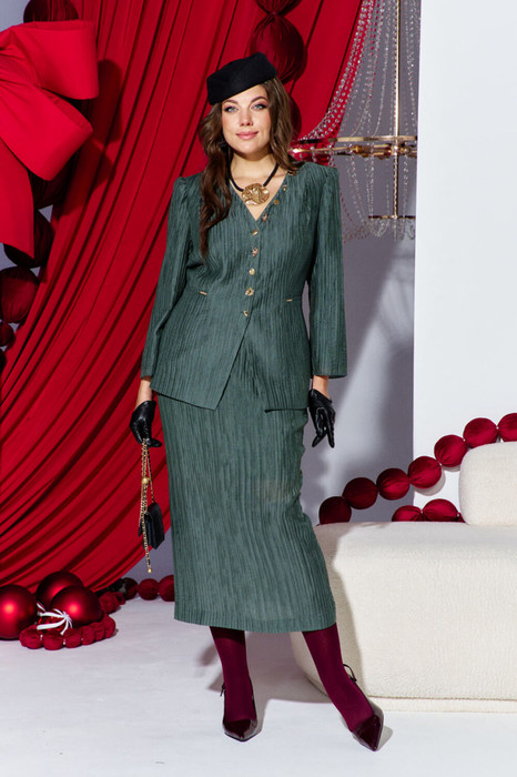 Костюм женский юбочный, состоящий из жакета и юбки. Этот феерический костюм соответствует сразу нескольким трендам! Стильный костюм сочетает в себе нарядность и в тоже время деловую элегантность. Ткань с эффектом «гофре» – хит сезона! Это структурированная ткань с жатым эффектом, который создаётся разным натяжением нитей в процессе ткачества. Жакет прилегающего силуэта, однобортный, с акцентом на ровную линию плеч, плавным V-образным вырезом горловины, застёжкой на декоративные петли-пуговицы по краю борта. По переду жакета вертикальные рельефы, декоративные складки от плеча, и имитация листочек кармана переходящих на спинку жакета. Спинка без особенностей. Рукав в жакете втачной, длинный, со сборкой по окату. Главным декоративным акцентом, который приковывает взгляд является россыпь пуговиц по борту, разных размеров и фактур. Это несомненно добавляет образу экстравагантность. Жакет на подкладке. Юбка прямого силуэта, длины «миди», с притачным поясом со вставкой эластичной тесьмы-резинки в бочках. В среднем шве юбки застёжка на потайную тесьму - молнию и пуговицу в поясе, с высоким разрезом от низа. Юбка на подкладке. Длина жакета по спинке 42 см (р 50-54), 45,5 см (р 56-60). Длина рукава 56 см. Длина юбки 85 см.