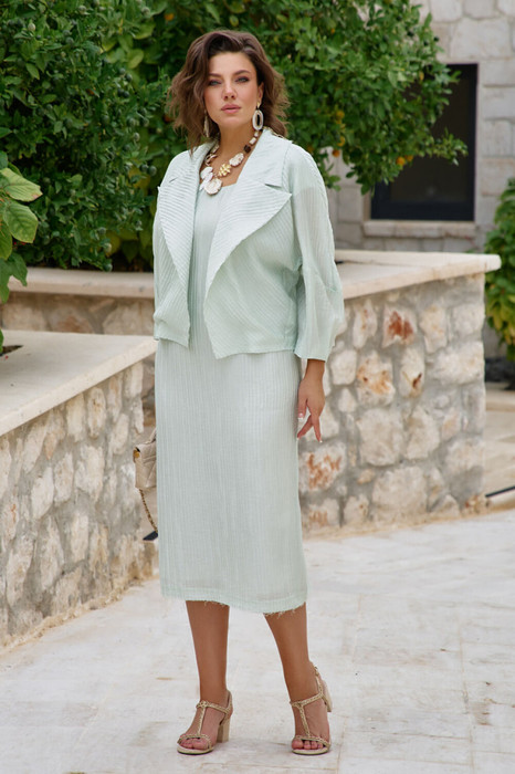 Стильный костюм, состоящий из жакета и платья, сочетает в себе летнюю расслабленность и деловую элегантность. Свободный крой жакета и прямое платье из формоустойчивого «гофре» помогут скрыть все несовершенства фигуры и создать идеальный силуэт! Особый шик и еще один тренд - игра с необработанными срезами! Жакет короткий, овального силуэта, с бочками. Без застежки. Воротник английский, с лацканами. Рукав цельнокроенный с защипом по низу, длиной 7/8. Жакет без подкладки. Край борта, воротника, лацкана и низ изделия имеют открытый срез, закрепленный прямой строчкой.Платье миди, прямого силуэта со спущенным рукавом, круглой горловиной и нагрудными вытачками из бокового шва. По среднему шву спинки - разрез. В боковом шве - застежка-молния. Платье на подкладке. Низ платья обработан с открытым срезом, закрепленным прямой строчкой. Длина жакета по спинке 54 см (р.50-54), 54,5 см (р.56-60). Длина рукава жакета (от горловины) 63 см (р.50-54), 64,5 см (56-60). Длина платья 117,5 см (р. 50-54), 118,5 см (р. 56-60). Длина рукава(плеча) 17,5 см(р.50-54), 18,5 см(р.56-60).