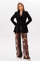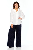 Костюм женский из плотного гладкокрашеного трикотажного полотна "кулирка", состоящий из футболки и шорт. Футболка - свободного покроя, с удлиненными плечевым и швами, короткими втачными рукавами и горловиной овальной формы, обработанной втачной планкой. В нижней части переда слева настрочен декоративный элемент прямоугольной формы. По горловине проложена отделочная строчка. Шорты - классического покроя, на притачном поясе с эластичной тесьмой внутри и карманами в боковых швах. Для регулирования степени прилегания шорт по талии в пояс вставлен шнурок, продетый через два отверстия в соединительных швах в центре пояса.