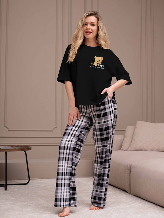 Костюм женский из трикотажного полотна "кулирка" в комбинации двух видов: гладкокрашеного и набивного с тематическим рисунком, состоящий из футболки и брюк. Футболка из гладкокрашеного полотна, свободного силуэта, со спущенной линией плеч и втачными короткими рукавами, горловиной овальной формы, обработанной втачной планкой и отделочной строчкой. В центре переда - принт, выполненгный в технике шелкографии. Брюки из полотна с набивным рисунком длинные, прямые, на притачном поясе с эластичной тесьмой внутри и карманами в боковыых швах.