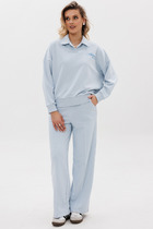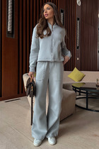 Костюм, состоящий из толстовки и брюк. Толстовка - свободного покроя, средней длины, с длинными рукавами на основе цельнокроеных. Деталь переда - с отрезной кокеткой, состоящей из четырех деталей, симметрично расположенных относительно центрального шва, обработанного с застежкой на тесьму "молния". Спинка - с отрезной кокеткой. Нижние срезы рукавов обработанышвом вподгибку с эластичной тесьмой. Низ изделия обработан швом вподгибку. По всем основным соединительным швам толстовки настрочены отделочные строчки. Брюки - длинные, свободного покроя, на притачном поясе с эластичной тесьмой внутри и карманами в боковых швах. Нижние срезы обработаны швом вподгибку с эластичной тесьмой. По низу джемпера и низу брюк - эластичная тесьма с фиксаторами для регулировки ширины изделий на этих участках.