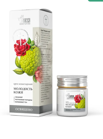 Крем "Молодость кожи" создан по монастырскому рецепту, включает в себя многочисленные природные компоненты, обеспечивающие глубокое питание, увлажнение и восстановление кожи.