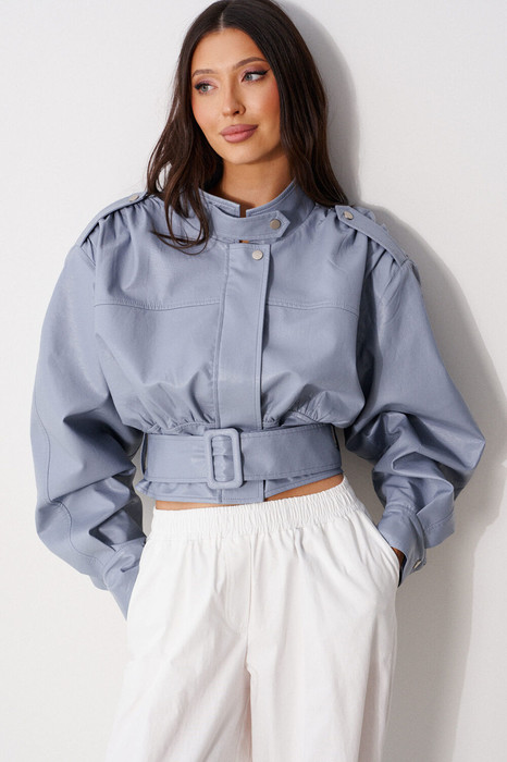 Куртка с акцентыми деталями, выполнен из эко-кожи постельно-голубого цвета. Характеристика: укороченный крой, воротник-стойка с застежкой-ремешком на кнопке, центральная застежка-замок, скрытая под планкой на кнопку сверху, плечевые швы сшиты сборкой и гармонично сочетаются с патами на кнопке, плечики, брендированный подклад, планка по низу изделия спереди, спинка отрезная, по спинке талия на резинке с кокеткой по низу, пояс в комплекте, рукав втачной слегка спущен, широкий манжет на одну кнопку. Длина рукава от края горловины 81см. Длина изделия по центру спинки 53см.