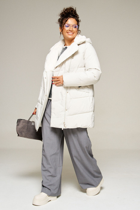 Воротник пиджачного типа с возможностью застегивания до верха. Внутренняя часть воротника и лацканы обработаны искусственным мехом.