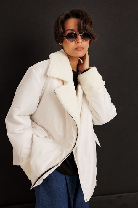 Куртка женская полуприлегающего силуэта из плащевой ткани. утеплена синтепоном, со смещенной бортовой застежкой на металлической тесьме «молния». Куртка на подкладке. Рукава втачные спущенные, по низу рукава притачная манжета из искусственного меха. По полочке обработаны накладные карманы с клапаном. Воротник с цельнокроеной стойкой. Искусственным мехом отделаны воротник и отложные борта.