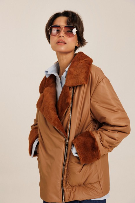 Куртка женская полуприлегающего силуэта из плащевой ткани. утеплена синтепоном, со смещенной бортовой застежкой на металлической тесьме «молния». Куртка на подкладке. Рукава втачные спущенные, по низу рукава притачная манжета из искусственного меха. По полочке обработаны накладные карманы с клапаном. Воротник с цельнокроеной стойкой. Искусственным мехом отделаны воротник и отложные борта.