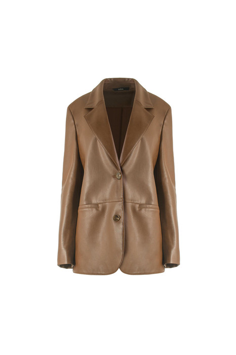 Куртка женская из искусственной кожи, однобортная, прямого силуэта, на подкладке. Застежка на 2 петли и пуговицы. Карманы-листочка в рельефах переда Воротник и лацкана отложные. Рукава втачные, двухшовные, в нижней части обтачная шлица на петли и пуговицы.