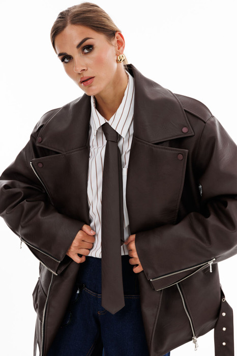 Куртка выпонена из эко-кожи. Куртка прямого силуэта, покроя "oversize". Спереди прорезные карманы, лацканы, один клапан справа, и смещенная застежка на молнию. На спинке фигурные подрезы от плечевого шва до боковых. Вортник пиджачного типа. Плечевой шов удлинен. Рукав рубашечного покроя, двухшовный. В заднем шве рукава молния с металлическими звеньями. В окаты вставлены погоны, по низу куртки протянут пояс из основной ткани с металлической пряжкой. На концах воротника, лацконов, по погонам и клапану пробивные кнопки. Куртка на утепленной притачной по низу подкладке.