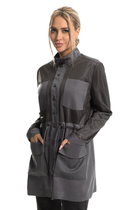 Куртка с центральной застежкой на кнопки, по линии талии- кулиса со шнуром- завязкой.На уровне линии груди расположены накладные карманы. На уровне линии бедер- накладные карманы с цельнокроенными клапанами. Спинка с отрезной кокеткой, линия плеча переходящая на перед. Рукав втачной, длинный, с отрезной манжетой.