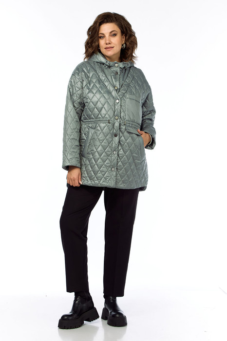 Куртка женская стеганная с капюшоном, свободного силуэта. Застежка центральная на пробивные кнопки. Полочка с фигурной вставкой из отделочной ткани, с накладным карманом и декоративными кулисами. Имеются прорезные карманы с листочкой. Спинка цельная. Рукава спущенные. Низ фигурной формы.