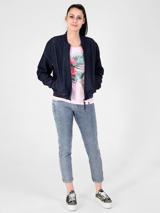 Женский модный бомбер, посадка Regular fit, с застежкой на металлическую молнию, двумя боковыми прорезными карманами «в рамку», рядом с левым карманом вышивка. Воротник-стойка, манжеты и низ бомбера из плотной трикотажной «резинки». Бомбер изготовлен из джинсового трикотажного полотна. Изделие  постирано, темная  стирка.