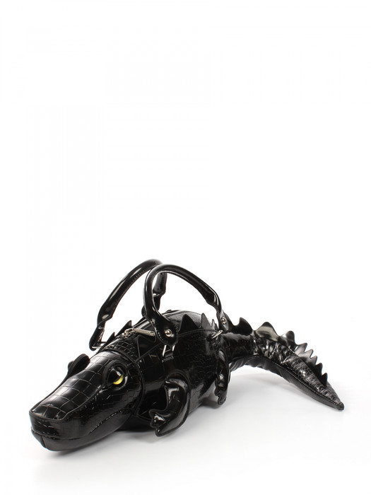 Сумка в виде крокодила выполнена из экокожи. Детали: 2 короткие ручки 30 см, 1 отстегивающаяся ручка от 110 см до 125 см. Внутри изделия: 1 отделение на молнии. Брендированная подкладка из хлопка. Металлическая брендированная фурнитура серебристого цвета. В комплекте фирменный пыльник для хранения сумки.