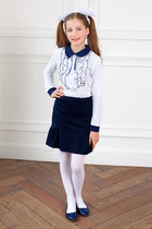 Лонгслив из трикотажного эластичного полотна.Воротник отложной - круглый и манжеты контрастного цвета,на полочке "рюши" из шифона ,с контрастной отделкой и бантик из атласной ленты.Празднично и красиво.Рекомендована длоя школы.